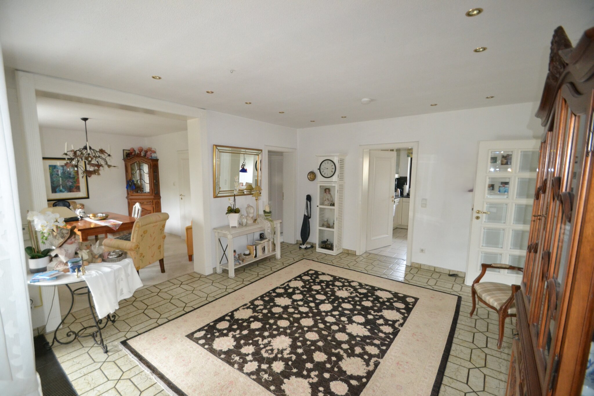 Erdgeschoss: Das Herzstück bildet das weitläufige Wohnzimmer sowie das separate Esszimmer, das durch seine großen Fensterfronten einen herrlichen Blick in den Garten ermöglicht. Die Küche ist funktional gestaltet und bietet direkten Zugang zu den Wohnbereichen.